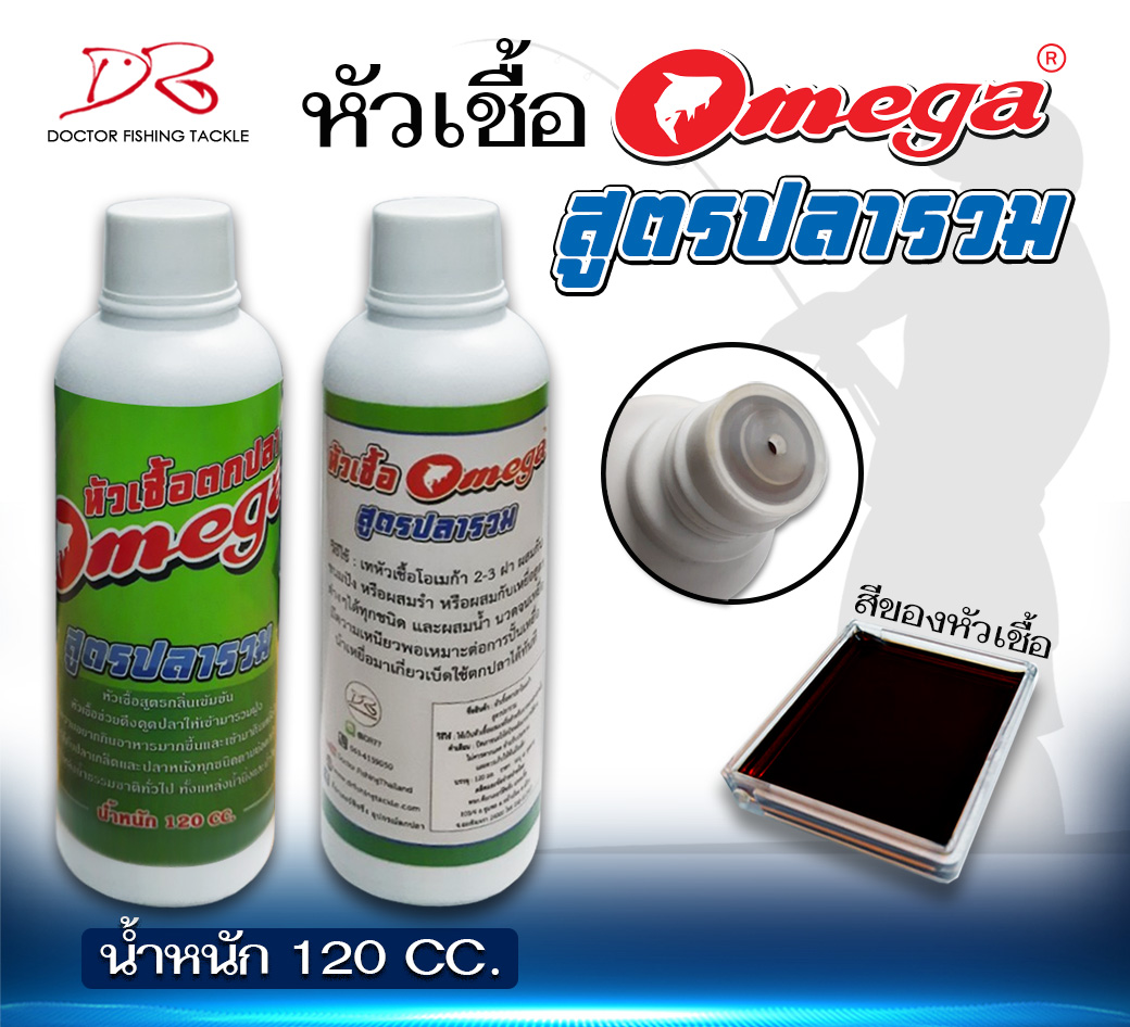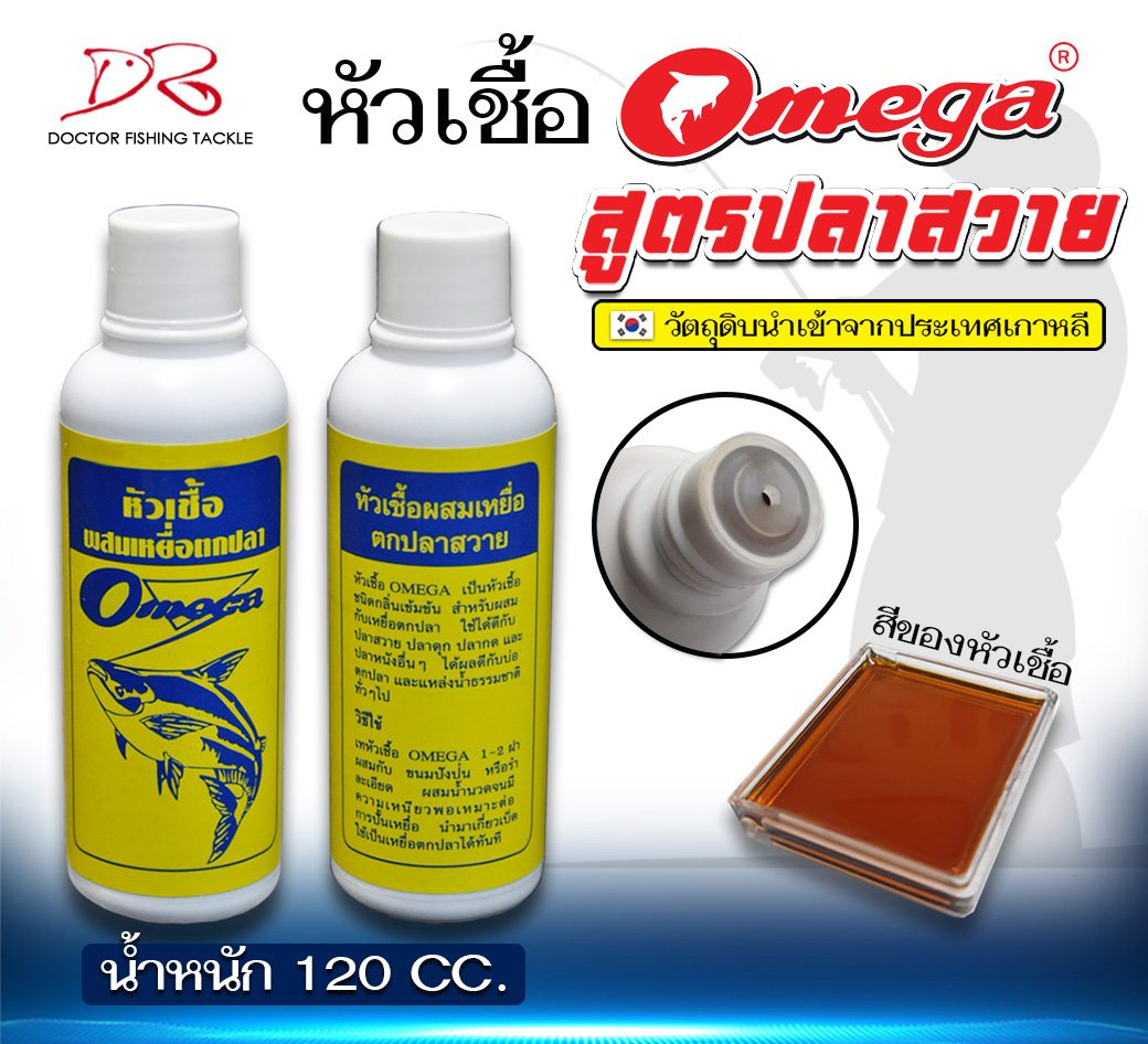หัวเชื้อ OMEGA มี 2 สูตรคือ หัวเชื้อ OMEGA สูตรปลาสวาย วัตถุดิบนำเข้าจากประเทศเกาหลี เป็นหัวเชื้อชนิดกลิ่นเข้มข้น สำหรับผสมกับเหยื่อตกปลา หัวเชื้อ OMEGA สูตรปลารวม เป็นหัวเชื้อสูตรกลิ่นเข้มข้น ช่วยดึงดูดปลาให้เข้ามารวมฝูง ใช้ได้ดีกับปลาเกล็ดและปลาหนังทุกชนิด สามารถใช้กับบ่อตกปลา และแหล่งน้ำธรรมชาติสภาพน้ำนิ่ง น้ำไหลได้