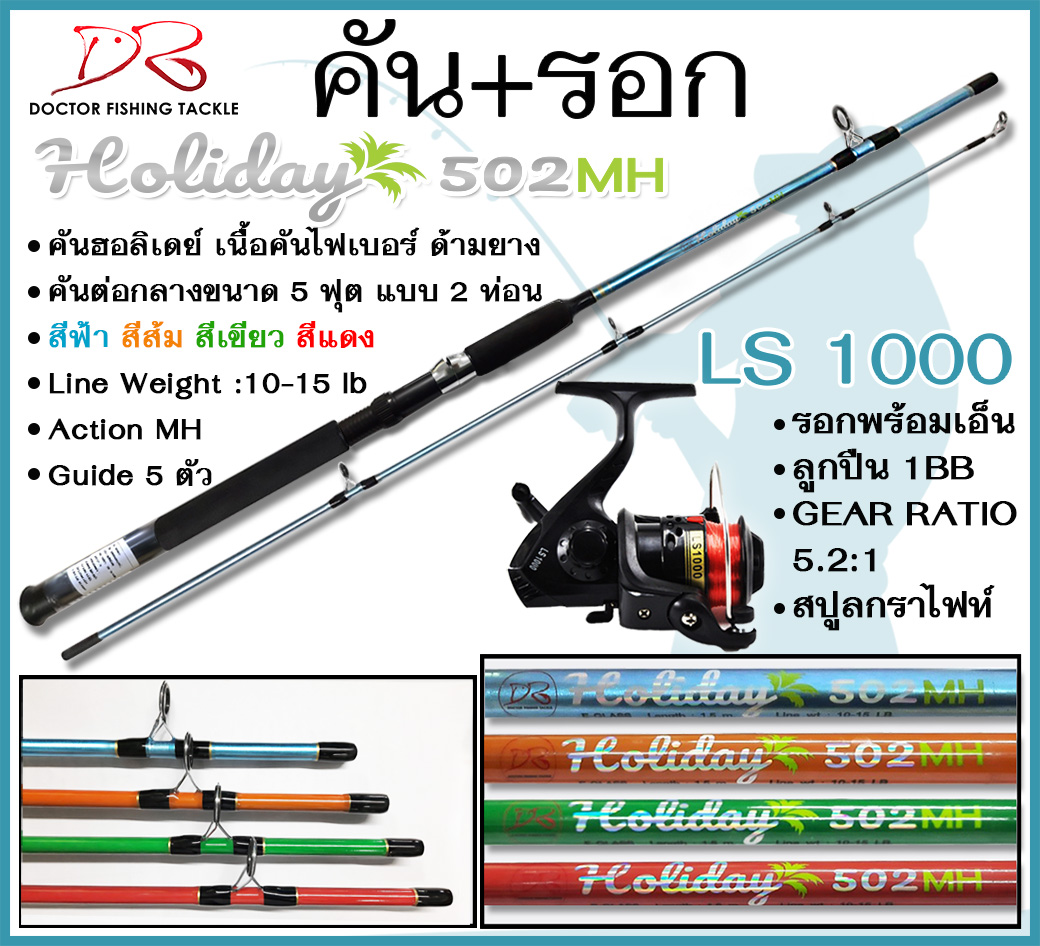 1 ชุด ประกอบด้วย คัน Holiday 502 MH - คันฮอลิเดย์ เนื้อคันไฟเบอร์ ด้ามยาง - คันต่อกลางขนาด 5 ฟุต แบบ 2 ท่อน - สีฟ้า สีส้ม สีเขียว สีแดง - Line Weight :10-15 lb. - Action MH - Guide 5 ตัว รอก LS 1000 - ลูกปืน 1 BB - GEAR RATIO 5.2:1 - SPOOL GRAPHITE - รอกพร้อมเอ็น
