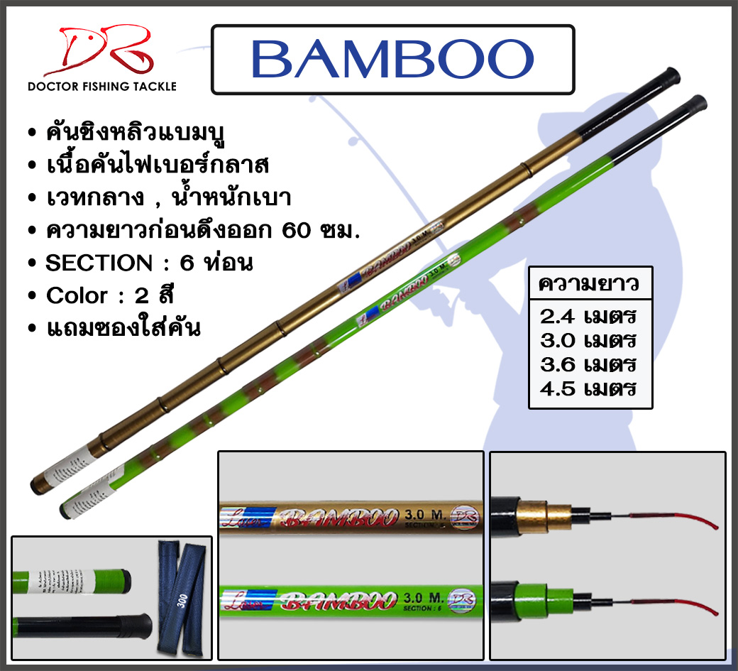 คัน Bamboo • คันชิงหลิวแบมบู • เนื้อคันไฟเบอร์กลาส • เวทกลาง , น้ำหนักเบา • ความยาวก่อนดึงออก 60 ซม. • SECTION : 6 ท่อน • Color : 2 สี • แถมซองใส่คัน