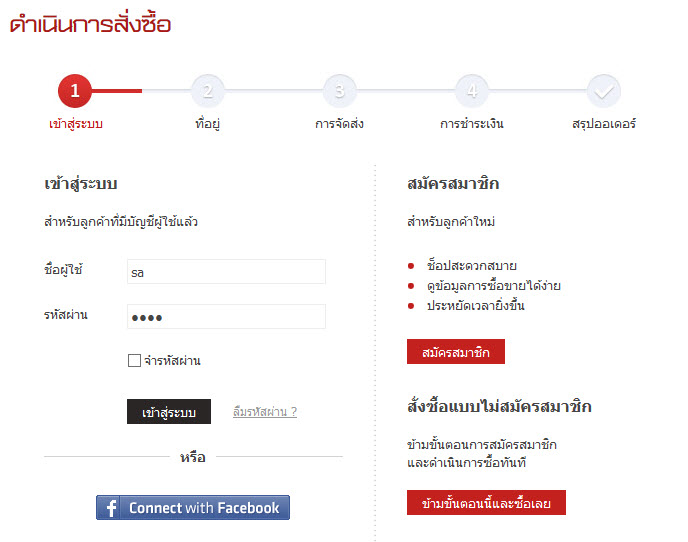 3. ในกรณีที่กดปุ่ม ชำระเงิน ระบบจะนำท่านเข้าสู่หน้า เข้าสู่ระบบ ซึ่งสามารถกรอกชื่อผู้ใช้และรหัสผ่านสำหรับท่านที่เป็นสมาชิกแล้ว หรือ สมัครสมาชิกใหม่ หรือ เลือกสั่งซื้อสินค้าโดยไม่สมัครสมาชิก
