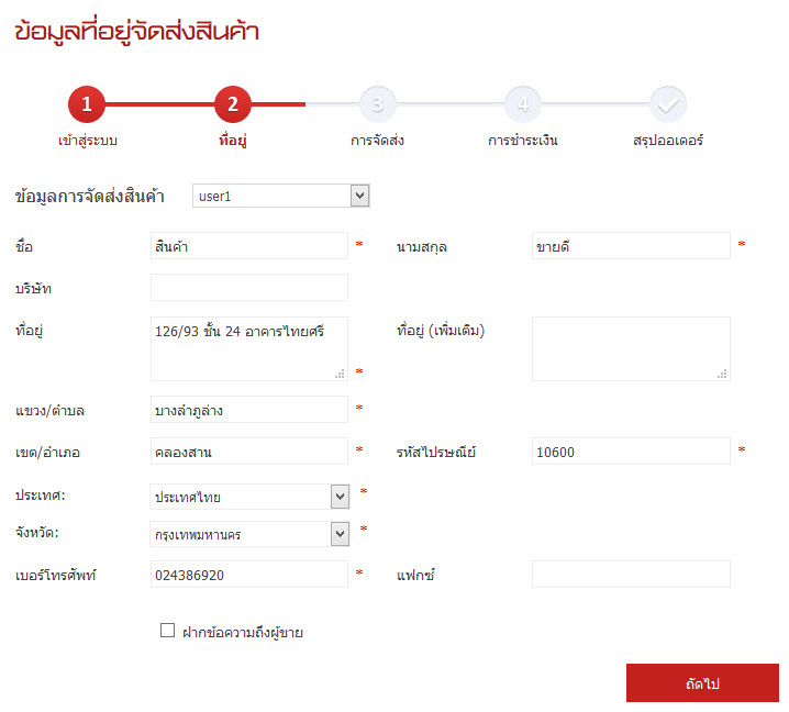 4. หากท่านเข้าสู่ระบบโดยใช้รหัสผู้ใช้งาน หรือสั่งซื้อโดยไม่สมัครสมาชิก ระบบจะแสดงข้อมูลการจัดส่งสินค้า ให้ท่านกรอกชื่อที่อยู่สำหรับติดต่อ และ ชื่อที่อยู่สำหรับจัดส่ง จากนั้นกด ถัดไป
